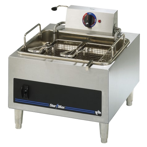 This Star® Star‐Max® Countertop Fryer is built for maximum efficiency. It has a snap‐action thermostat that provides temperature control from 200°F to 375°F. The immersion‐type heating elements allow for even heat distribution, and swing up for maintenance. This fryer has a 15 lb. oil capacity, and has removable baskets and a removable kettle for straining.