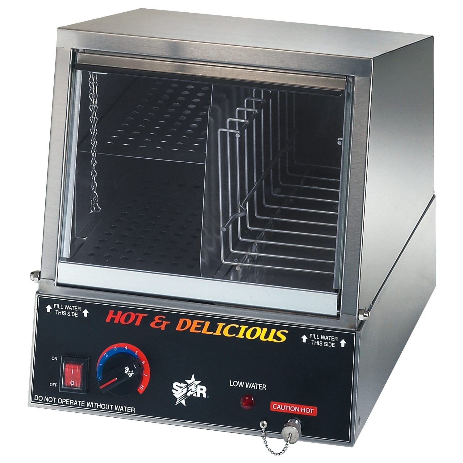 This Star Hot Dog Steamer is ideal for hot dogs and buns or a variety of other food products suitable for steaming. It holds approximately 170 hot dogs and 18 buns at a time, and its side‐by‐side design provides more control of heat and humidity. This steamer includes an 11 Quart water pan, with a low water indicator light. A front drain valve allows for easy cleaning.
