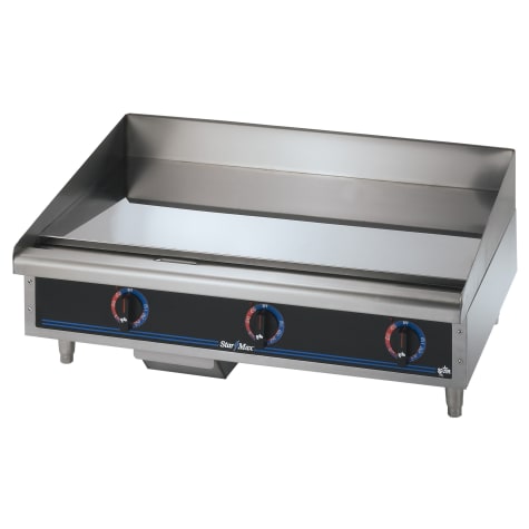This Star‐Max® countertop electric griddle features a chrome‐plated stainless steel cooking surface for even heat distribution. The highly polished chrome surface reflects heat inward reducing radiant heat saving on energy and keeps the kitchen cooler. The non‐porous chrome surface eliminates food taste transfer and is easy to clean. This griddle has a 4000 watt element every 12", and snap‐action thermostatic controls provide temperatures between 150° and 450°F.