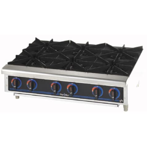 This Star® Star‐Max® Hot Plate is designed for years of reliable cooking performance. It has six burners, operating at 150,000 total BTU. It has heavy‐duty metal knobs and cast iron grates, and uses natural gas. A removable crumb tray allows for easy cleaning.
