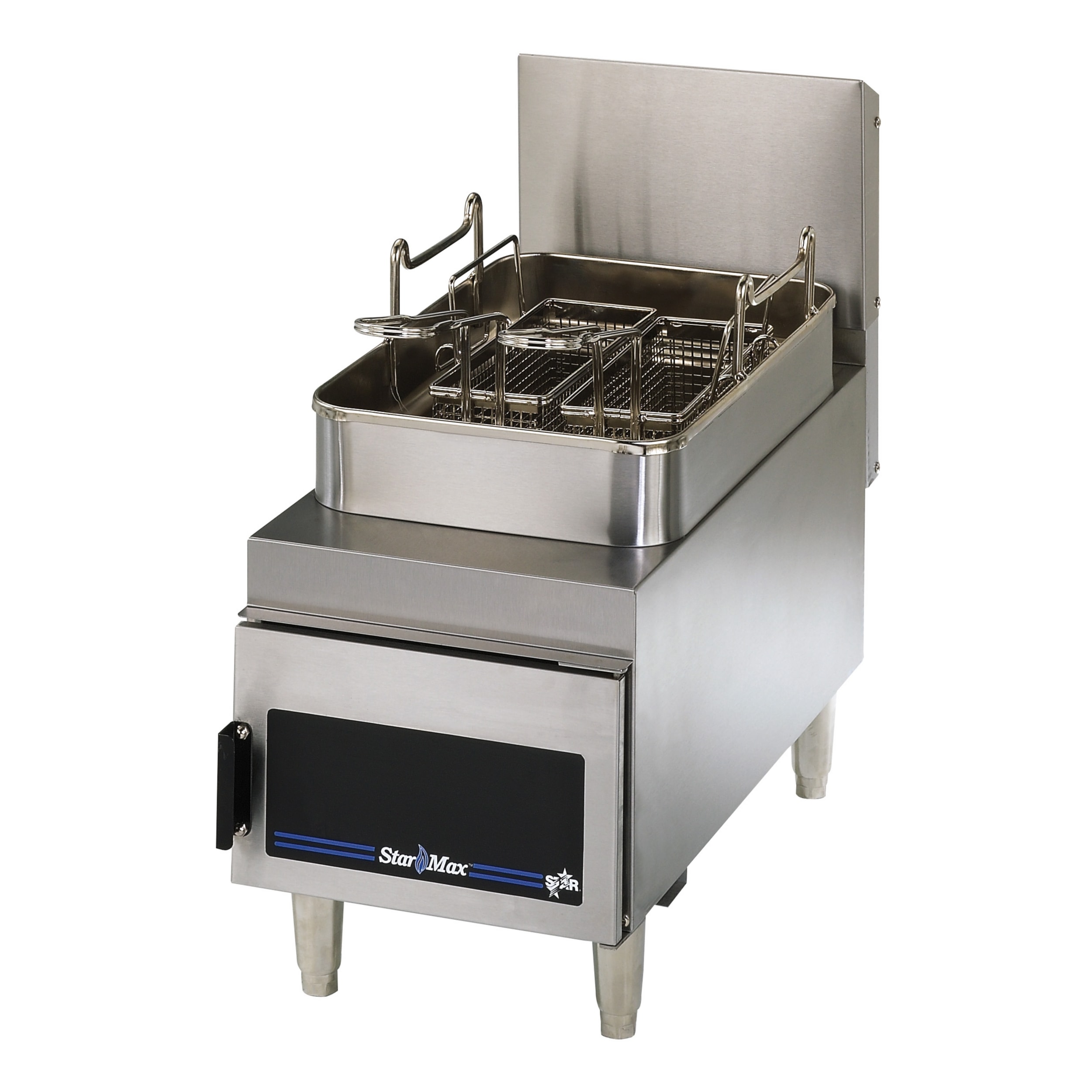 This Star® Star‐Max® Fryer is a high performance fryer that makes a great addition to any food service operation. It has a 15 lb. capacity and has two chrome plated steel mesh baskets. It has an automatic pilot for fast and easy ignition, and a temperature range of 200°F to 375°F. This fryer has a convenient front access drain valve.