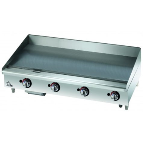 This Star® Star‐Max® Gas Griddle has a manual control and is great for cooking breakfast, lunch, or dinner. It has a highly polished 1" thick griddle surface and a thermostat that adjusts from 150°F to 450°F. It features heavy‐duty all‐welded body construction and has a tapered stainless steel splash guard and grease trough for easy cleaning. It stands on heavy‐duty 4" adjustable legs.