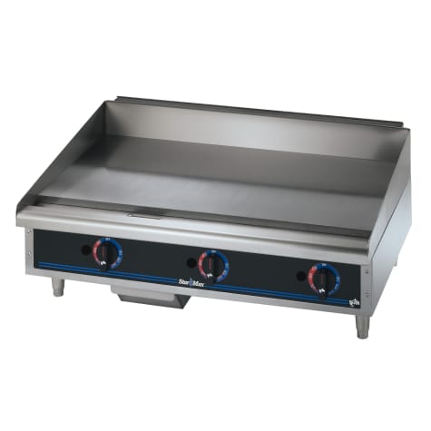 This Star® Star‐Max® Gas Griddle has an embedded modulating thermostat and is great for cooking breakfast, lunch, or dinner. It has a highly polished 1" thick griddle surface and the thermostat adjusts from 150°F to 450°F. It features heavy‐duty all‐welded body construction and has a tapered stainless steel splash guard and grease trough for easy cleaning. It stands on heavy‐duty 4" adjustable legs.