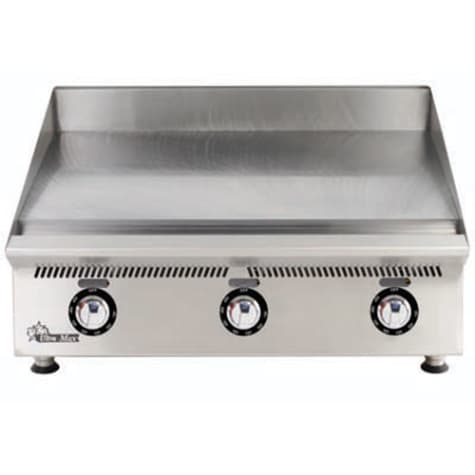 This Star® Ultra‐Max® Gas Griddle has a 36" width and is a reliable, efficient way to cook a variety of foods. It features a 1" thick polished steel griddle plate, and has a temperature range of 150°F to 550°F. It is finished with a side and rear splash guard, and a grease trough for easy cleanup. Optional mechanical snap‐action thermostats use sensors embedded 0.1875 in. (5 mm) from the cooking surface every 12 inches (305 mm) for precise temperature control