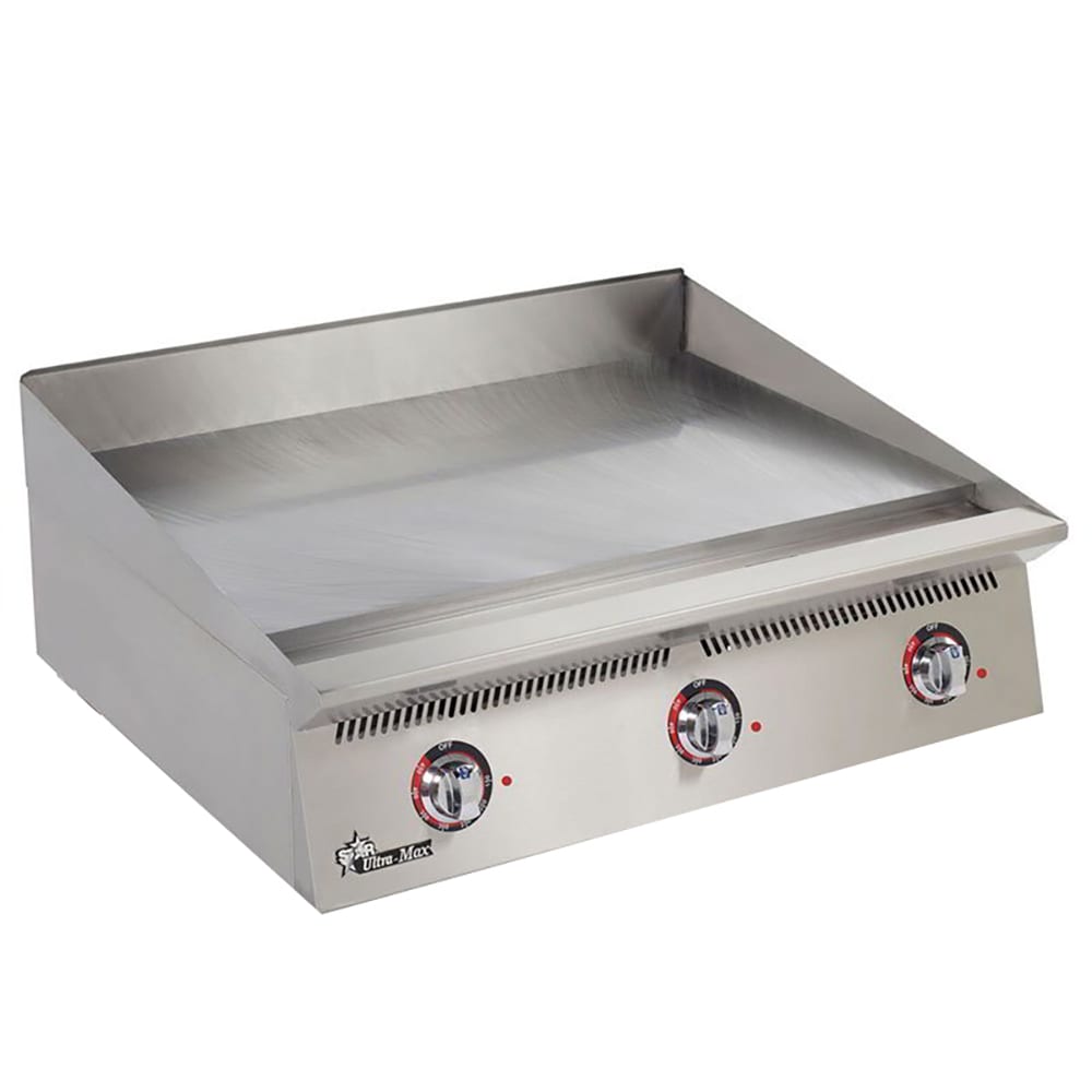 This Star® Ultra‐Max® Gas Griddle has a 36" width and is a reliable, efficient way to cook a variety of foods. It features a 1" thick polished steel griddle plate, and has a temperature range of 150°F to 550°F. It is finished with a side and rear splash guard, and a grease trough for easy cleanup.