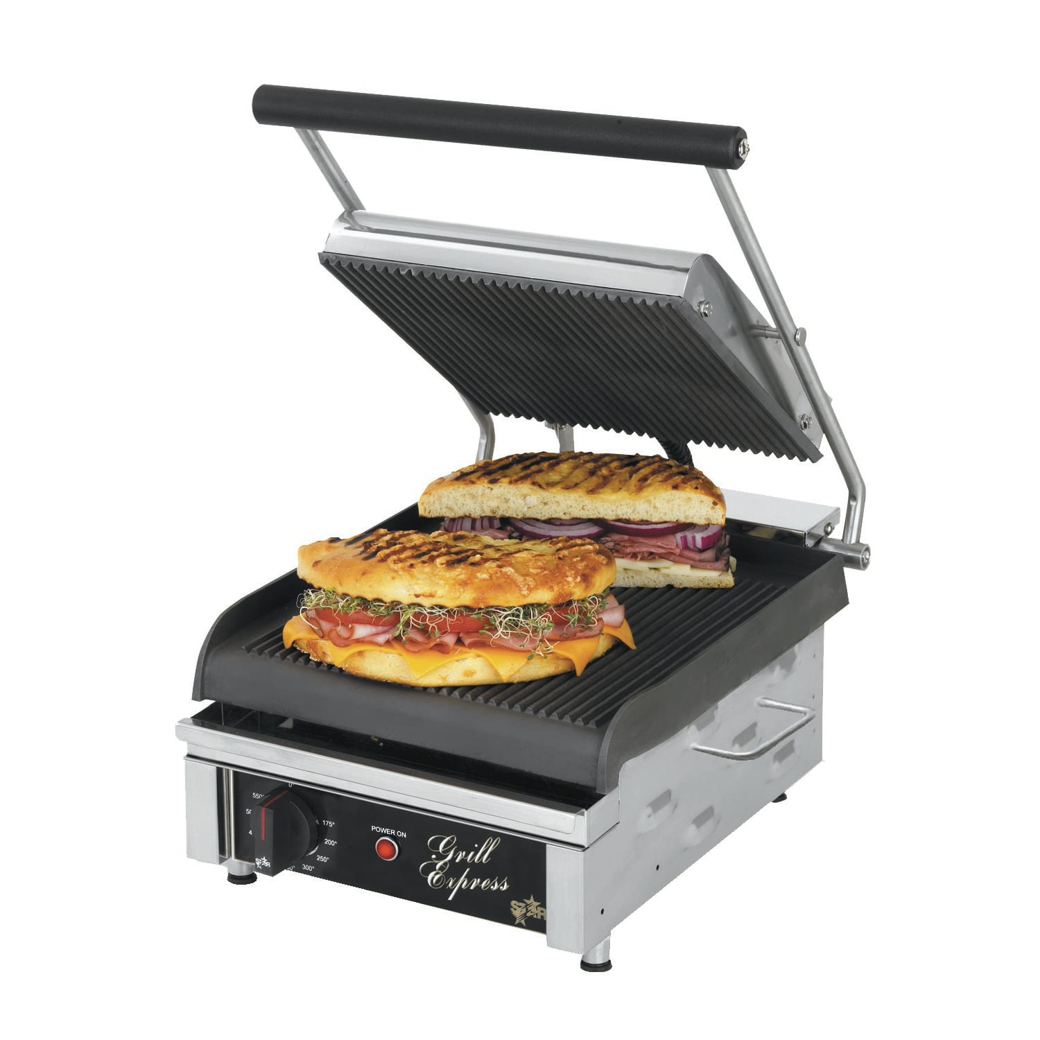 This Star® Grill Express™ Sandwich Grill is great for sandwiches, quesadillas, chicken, steak, and more. It operates from 175°F to 450°F and is controlled by a manual thermostat. It has heavy‐duty grooved cast iron plates, and a heat‐resistant handle. This grill includes a removable grease trough for easy cleanup.
