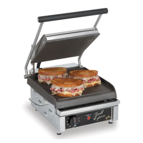 This Star® Grill Express™ Sandwich Grill is great for sandwiches, quesadillas, chicken, steak, and more. It operates from 175°F to 450°F and is controlled by a manual thermostat. It has heavy‐duty smooth cast iron plates, and a heat‐resistant handle. This grill includes a removable grease trough for easy cleanup.