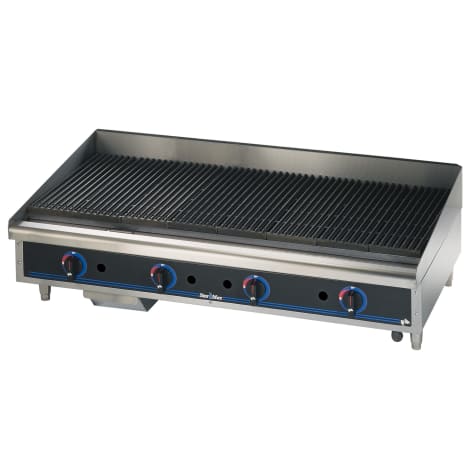 This Star® Star‐Max® Charbroiler uses heavy‐duty radiants to transfer heat to products. It can be used for a variety of foods, and has adjustable grates that are reversible with a thin side for searing and a thick side for delicate items. It features a cool‐to‐the‐touch stainless steel bullnose and has a stainless steel splash guard and large capacity water pan for easy cleanup.