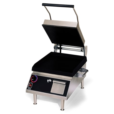 This Star® Pro‐Max 2.0® Sandwich Grill can be used to cook wraps, sandwiches, chicken, hamburgers, and more. It has a smooth plate style and a heavy‐duty spring hinge system that allows for thick food items. It operates between 175°F to 550°F. This grill is made from stainless steel and is corrosion‐resistant.