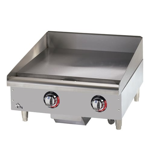 This Star‐Max® countertop electric griddle features a polished steel plate cooking surface for even heat distribution. It has a snap‐action thermostat that adjusts from 150°F to 450°F, and features a 4000 Watt element every 12" of cooking surface. It has a heavy‐duty all‐welded body and includes a grease trough, grease chute, and splash guard.