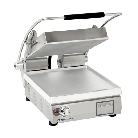 This Star® Pro‐Max 2.0® Sandwich Grill can be used to cook wraps, sandwiches, chicken, hamburgers, and more. It has a smooth aluminum plate style and a performance torsion spring hinge system that allows for thick food items. It operates between 175°F to 550°F. This grill is made from stainless steel and is corrosion‐resistant.