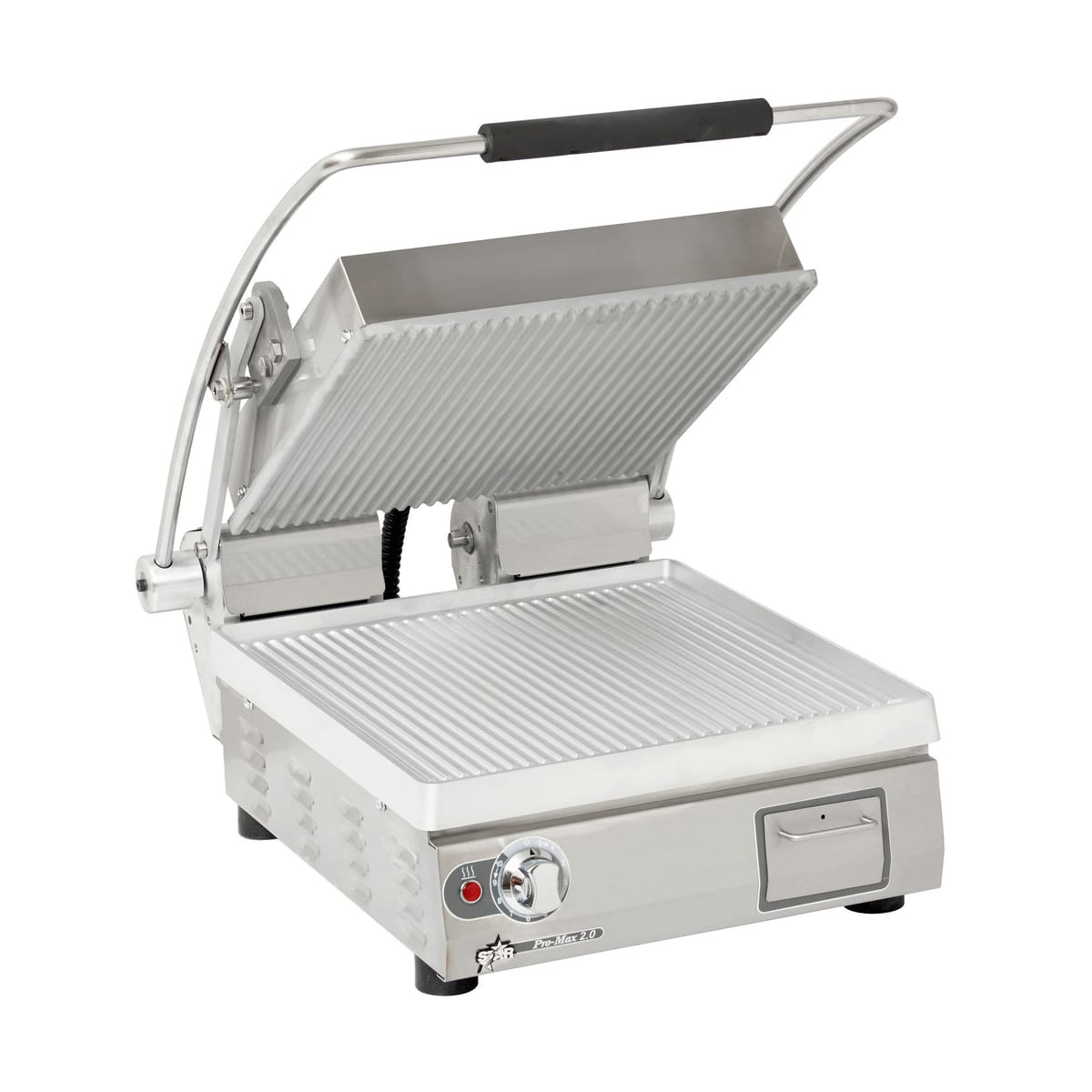 This Star® Pro‐Max 2.0® Sandwich Grill can be used to cook wraps, sandwiches, chicken, hamburgers, and more. It has a grooved plate style and a heavy‐duty spring hinge system that allows for thick food items. It operates between 175°F to 550°F. This grill is made from stainless steel and is corrosion‐resistant.