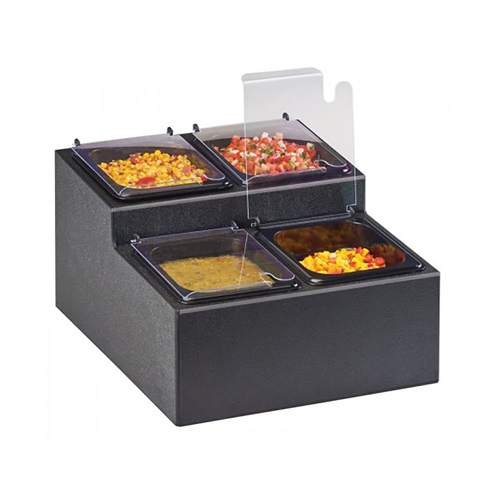 The Cal-Mil 3687-13 is a durable ABS plastic condiment station with four compartments, ideal for organizing relishes, salsas, fruits, and more. Its tiered, stairstep design allows for easy access to each section, while clear plastic flip-up lids ensure sanitation and visibility. This station is perfect for high-volume settings.