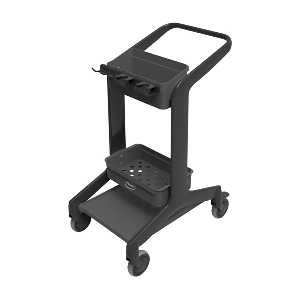 This black Vikan HyGo Mobile Cleaning Station is designed to enhance your cleaning routine with its efficient and maneuverable design. It features a narrow frame and 360-degree wheels, making it easy to navigate through tight spaces. The customizable tool modules and brackets can hold up to five tools, expandable to 12 with additional brackets. The upper tray can carry up to 26 lbs., and the lower tray can support up to 44 lbs. The HyGo Cleaning Station can be disassembled for thorough cleaning, ensuring a hygienic environment in food and beverage settings.