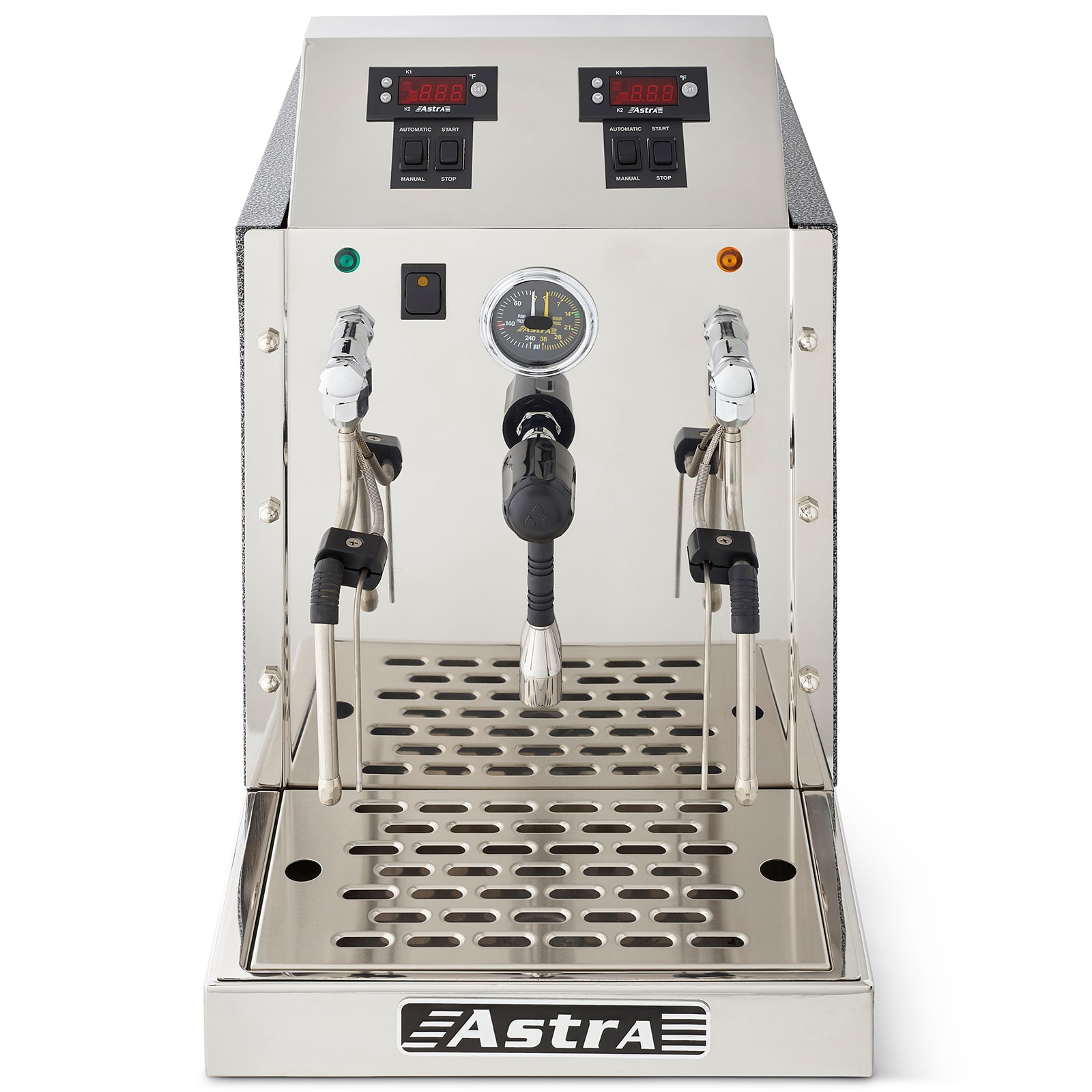The Astra STA2400 includes a 4.2 liter copper boiler with automatic water fill functionality to keep your machine running smoothly. Two automatic steam wands can be programmed and operated independently & turn off when drink reaches programmed temperature. The thermocoupled, cool-touch stainless steel steam wands provide automatic temperature control and continuous steam, ensuring quick recovery between drinks. Additionally, a manual operation switch on the front panel gives you full control whenever it's needed. All of the STA2400's high-quality, US standard components are enclosed in an attractive stainless-steel frame.