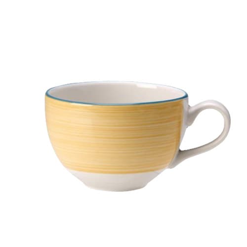 This 3 ounce cup and has the low profile and yellow body of the Rio Yellow dinnerware collection.