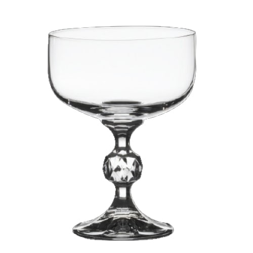 This Vintage Stems 6.75 ounce champagne saucer has a faceted stem that adds a unique and trendy look to the classic cocktail presentation.