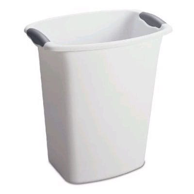 This Sterilite® Wastebasket has a 3 gallon capacity. It is made from white plastic and has grey handles. This wastebasket has a textured surface which is easy to clean.