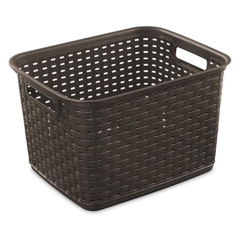 This Sterilite tall weave basket has the decorative look of wicker with the easy to clean plastic construction. Rectangular in shape, this basket is ideal for reducing clutter on countertops, pantries, bookshelves, entertainment centers and more. You can use with other Sterilite Storage Baskets to create the storage that fits your needs. The reinforced rim provides a great gripping location for lifting and transporting contents.