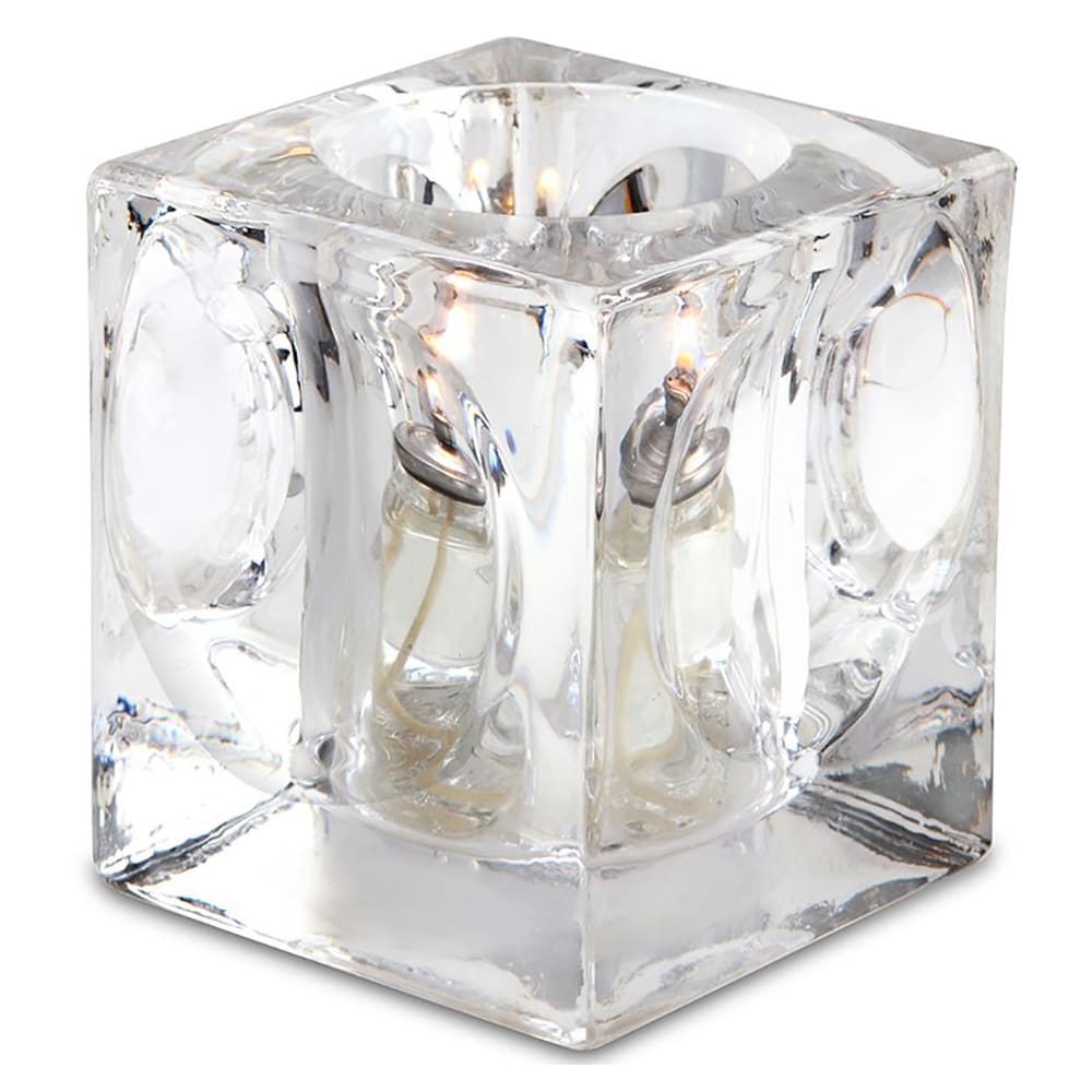 This Sterno Products® Presidio votive lamp features an elegant square geometric design with clear beveled sides.
