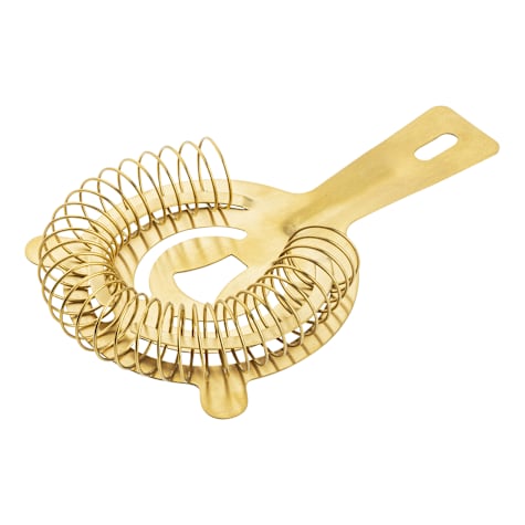 Showcase your bartending game with this professional-grade 2-prong Hawthorne strainer crafted from durable 18/8 stainless steel and finished in elegant gold. Its tight curved spring ensures a secure fit for mess-free pouring, while precision strainer holes keep ice and herbs out of your cocktails. Designed with an ergonomic handle for comfort and control, this stylish tool combines functionality with sophistication—perfect for home bars, restaurants, and catering setups. This compact strainer is a must-have for any mixologist seeking quality and flair!