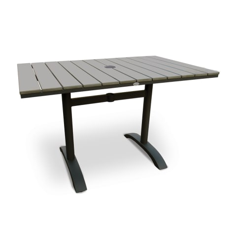 The Just Chair Perma‐Wood Outdoor line is scratch proof and stays cool to the touch. This table has an umbrella to shield customers from the sun. Stackable chairs to match are available.