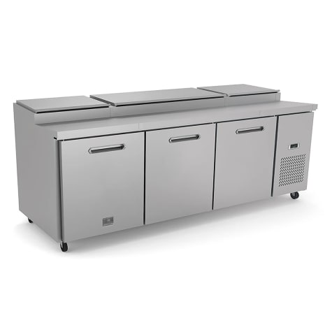 This 3-door pizza prep table from Kelvinator is 94" wide and holds (12) 1/3 size pans. The cabinet is completely insulated with high density polyurethane for low environmental impact and the insulated lid maintains food freshness.