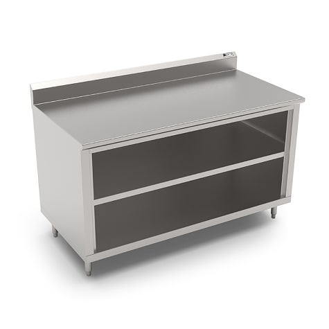 This Modular Stainless Steel Work Table features a 14 gauge durable stainless steel top and is equipped with an open front to keep all your tools, dishes, or necessities stored. This work table includes a stainless steel 5" rear riser to prevent splashes, debris or unwanted supplies to fall off the back of the table. This is a great stainless steel work table to suit your needs, whether at home, in a restaurant, in a bakery, or even in a garage.