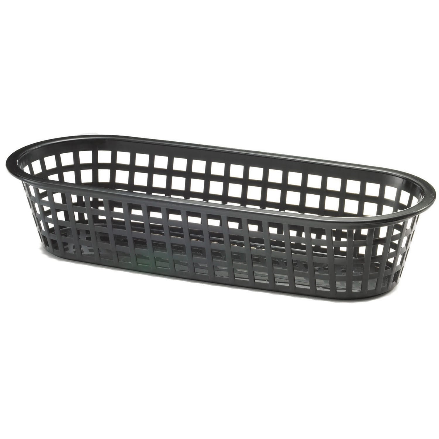 This TableCraft 1018BK black oblong plastic fast food / loaf basket is perfect for serving subs, meatball sandwiches, cheese steak sandwiches, or garlic bread. The polypropylene construction holds up to years of heavy use. It's also microwave,