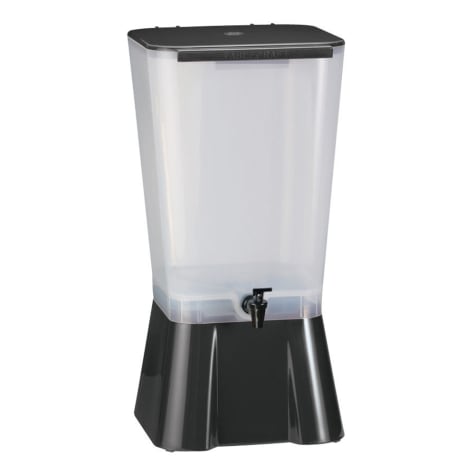 This TableCraft 5 gallon black and white plastic beverage dispenser comes with graduated on the side of the reservoir. It also comes with a Tomlinson Faucet.