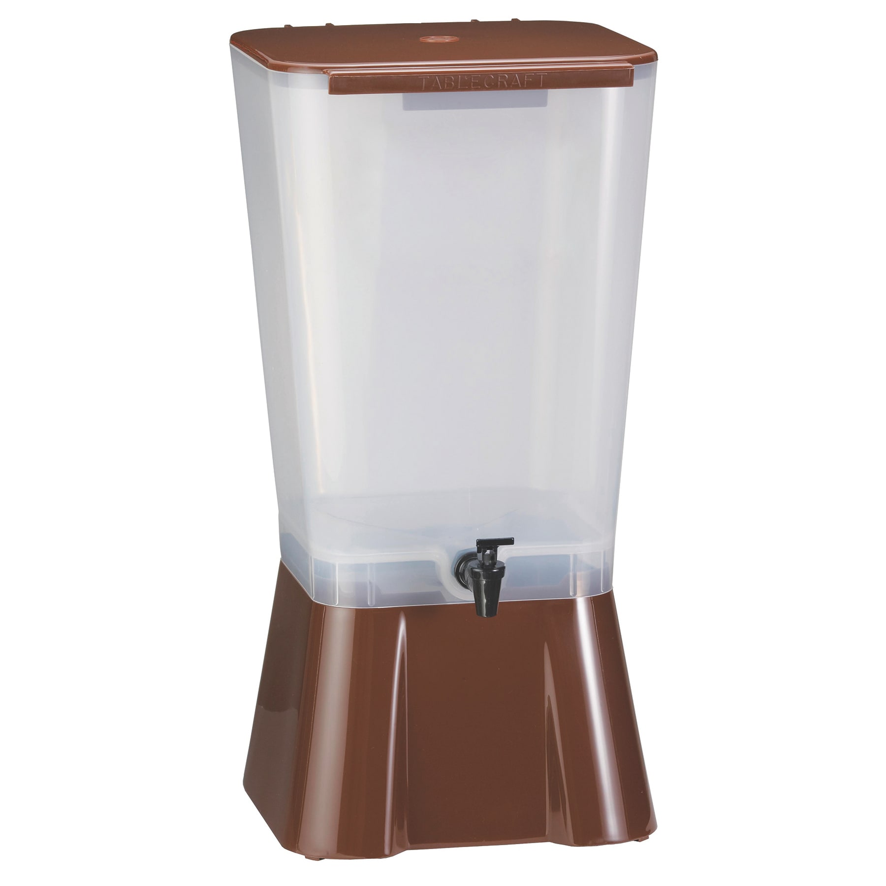 This TableCraft 5 gallon brown and white plastic beverage dispenser comes with graduated on the side of the reservoir. It also comes with a Tomlinson Faucet.