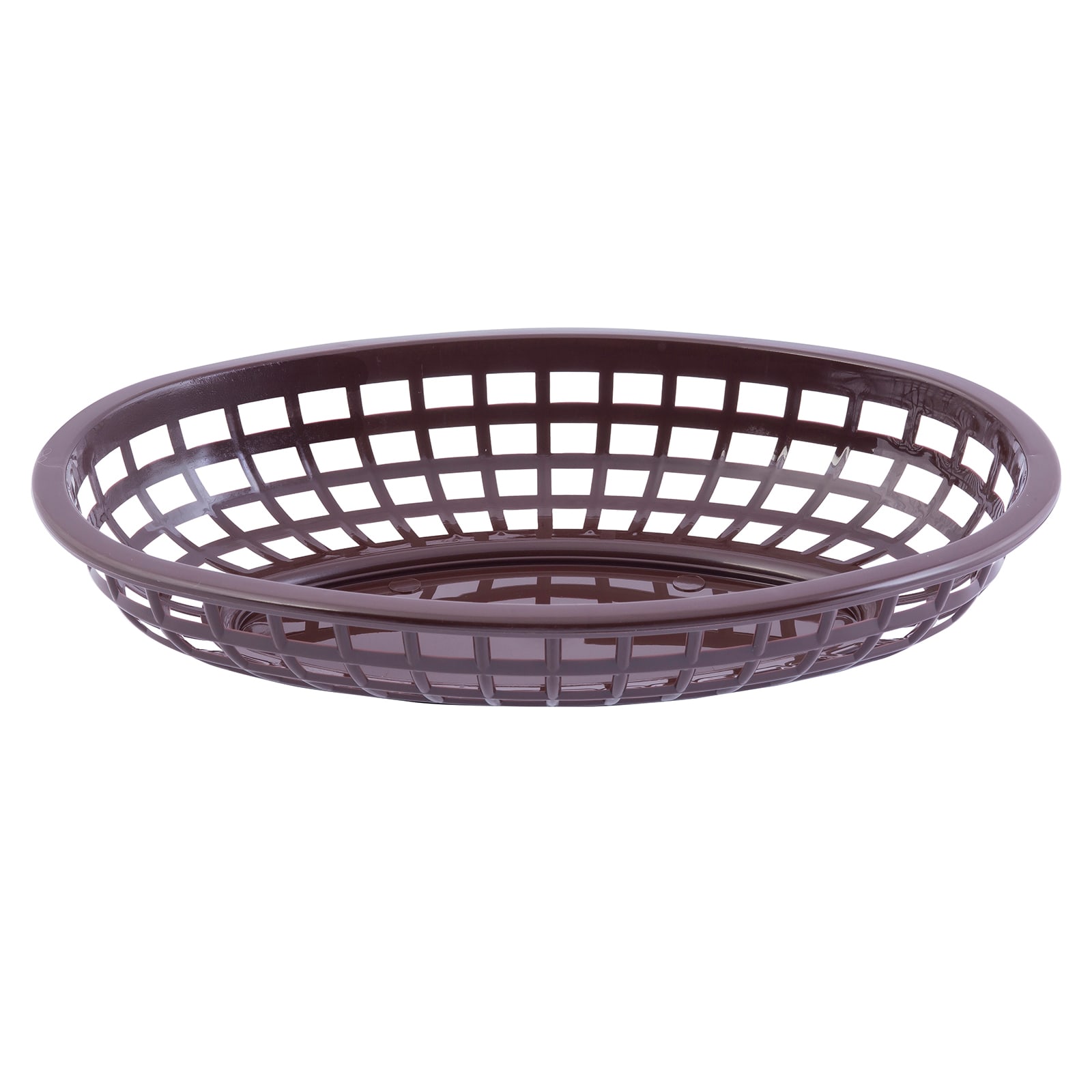 This TableCraft 1074BR classic oval basket is stackable, holds up under heat lamps, and is microwave and dishwasher safe.