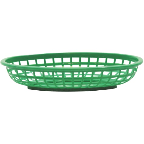 This TableCraft 1074G green oval basket is stackable, holds up under heat lamps up to 150°F, and is microwave and dishwasher safe.