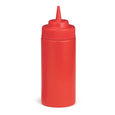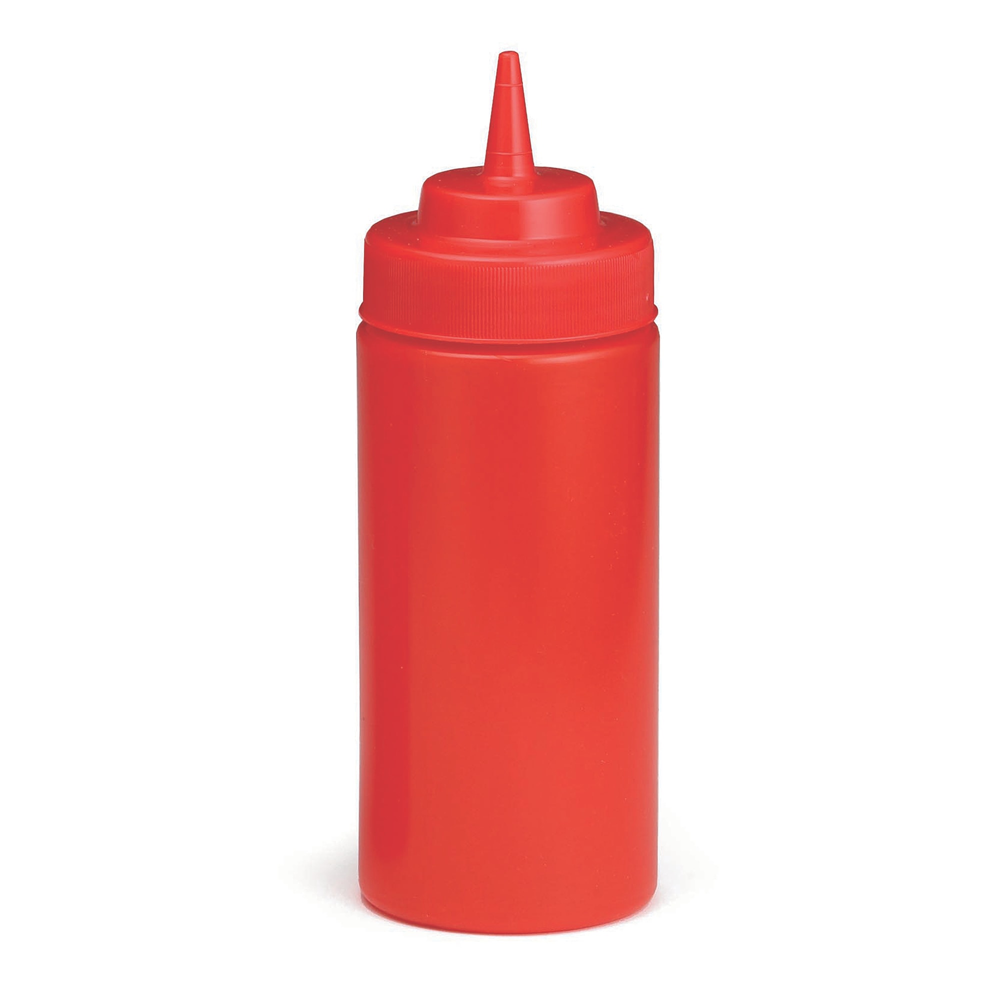 This TableCraft 11663K 16 ounce ketchup squeeze dispenser is made with clear soft polyethylene for quick and easy prep and a standard red tip with 63 mm opening.