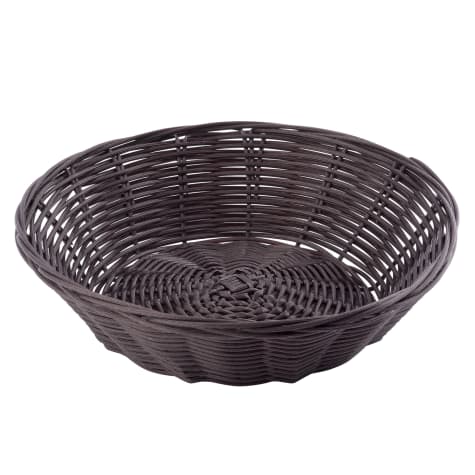 This brown round rattan basket is an elegant, attractive solution for fruits or breads. it's woven polypropylene cord construction is easy to clean with a damp cloth.