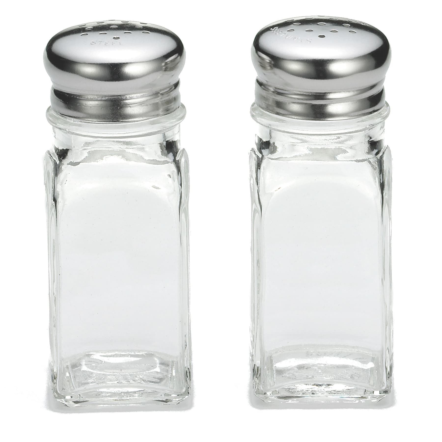 These TableCraft 154S&P‐1 salt & pepper shakers are durable and attractive. They feature a square glass body with 18/8 stainless steel mushroom shape tops. Fits rack models 5457112R, 593RBK, 594C, 609R, and 609RBK.