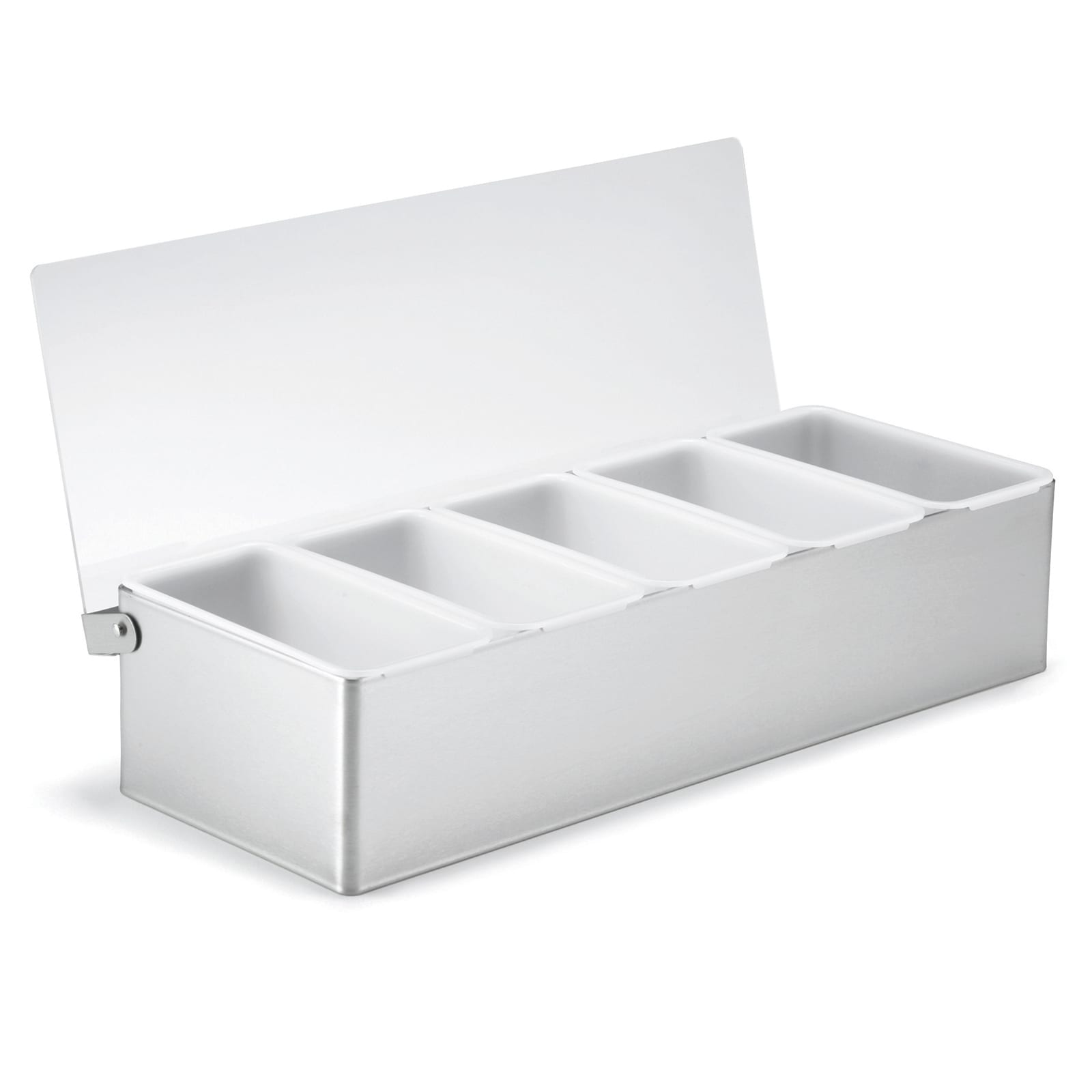 Great accessory for your bar and a necessity when making drinks. This condiment holder is constructed of heavy gauge stainless steel, It has a shatter proof polyethylene lid and five, one‐pint plastic inserts. This container has no bottom, and the box is therefore not made to hold ice.