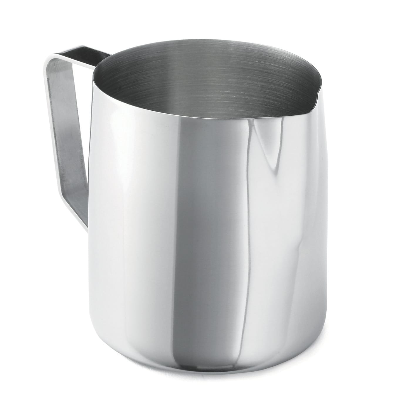 This 32‐36 ounce frothing cup from TableCraft is constructed of durable stainless steel and is perfect for use at barista stands and coffee shops.
