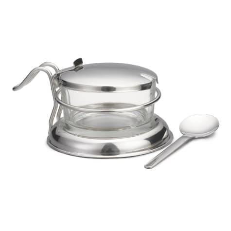 This TableCraft Condiment Jar Set is ideal for serving condiments such as sugar, grated cheese, relish, sauce, jam, jelly, pickles etc. The set includes a heavyweight glass jar with a 18‐8 stainless steel holder and lid. A stainless steel serving spoon is also included.