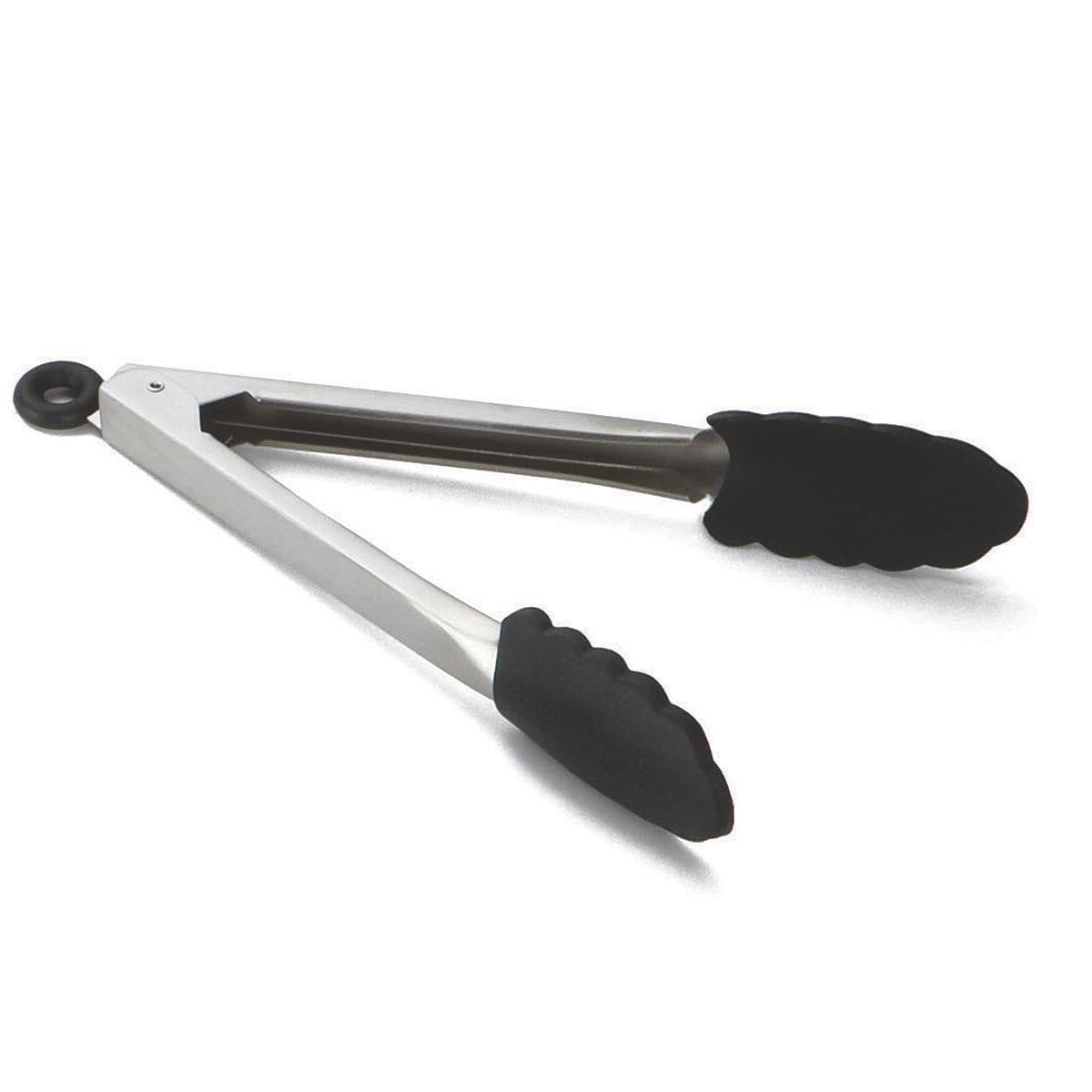 This TableCraft 9" tong has a black silicon tip with a one piece, spring steel construction. These tongs have a locking feature when storing.