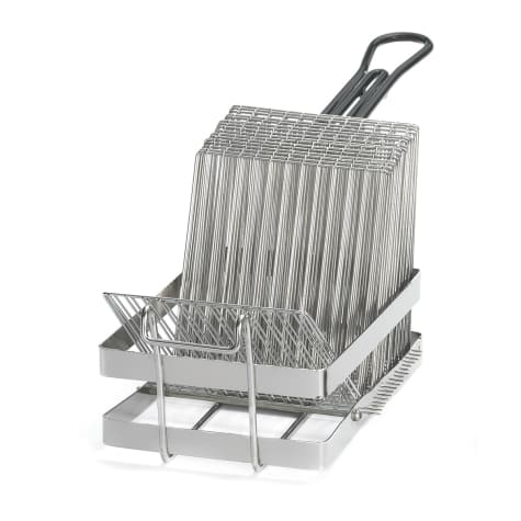 This TableCraft chrome plated tostada fry basket holds seventeen 6" tostada shells and comes with Black cool‐to‐touch PVC handles.