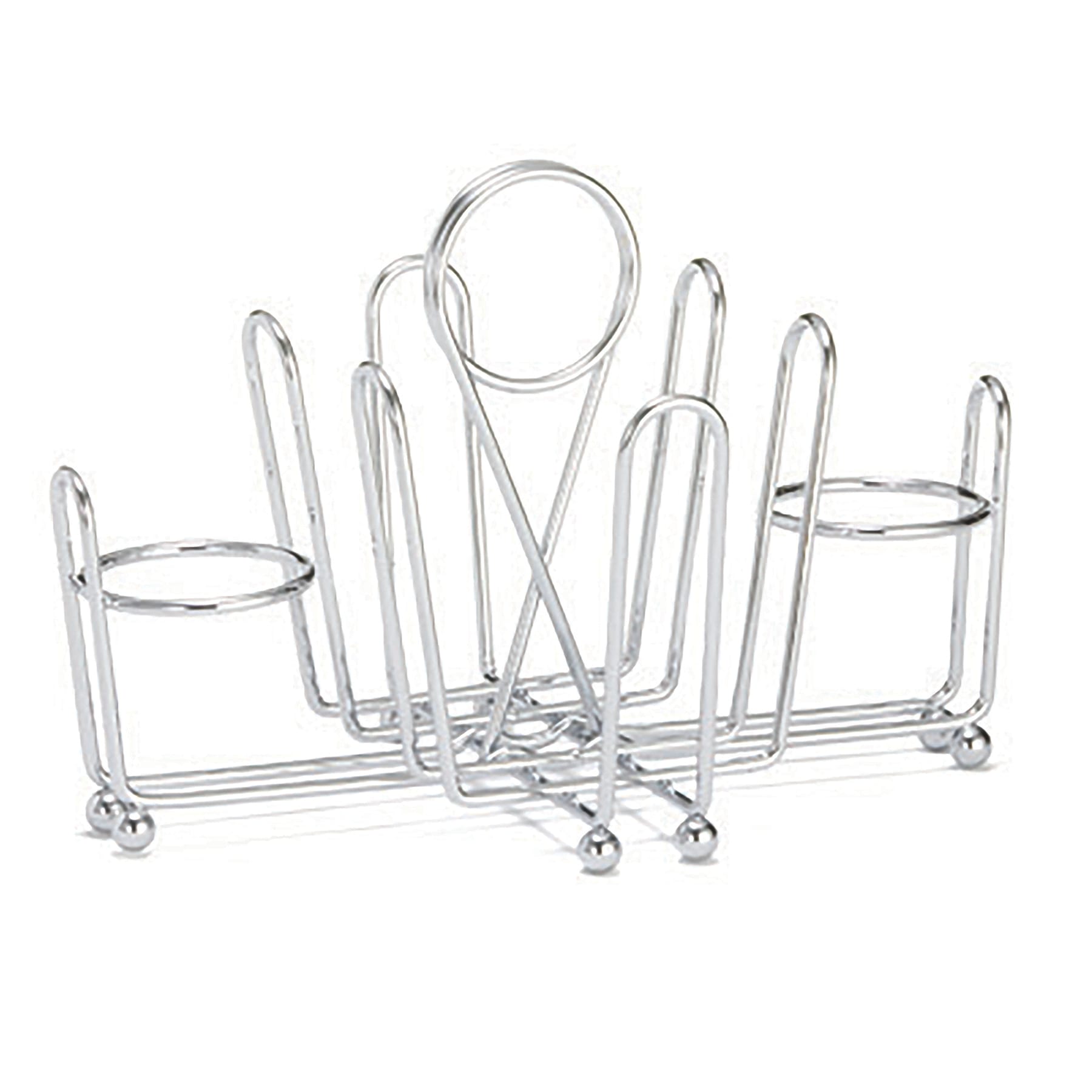 TableCraft 591C Chrome Racks are constructed of heavy weight chrome plated metal. This chrome rack features a built in merchandising ring, fits 1‐5/8" diameter salt & pepper shakers and 2‐3/4" x 2" packets.