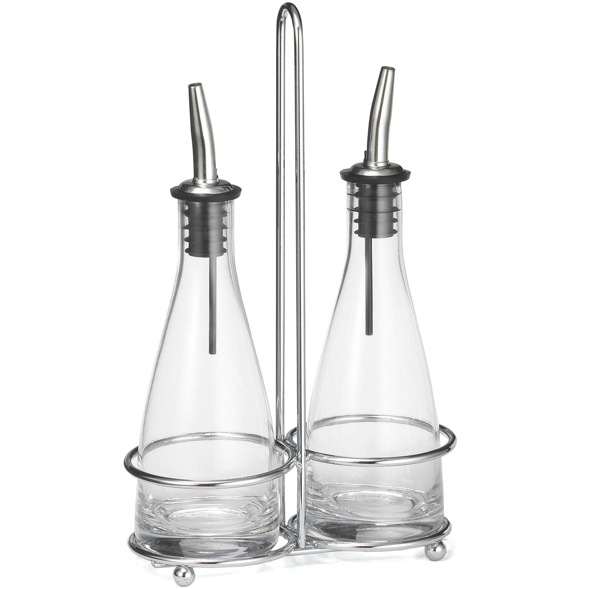 This TableCraft Oil & Vinegar Cruet Set provides a stylish presentation for your salad service. It has vase shaped glass containers and stainless steel pourers.