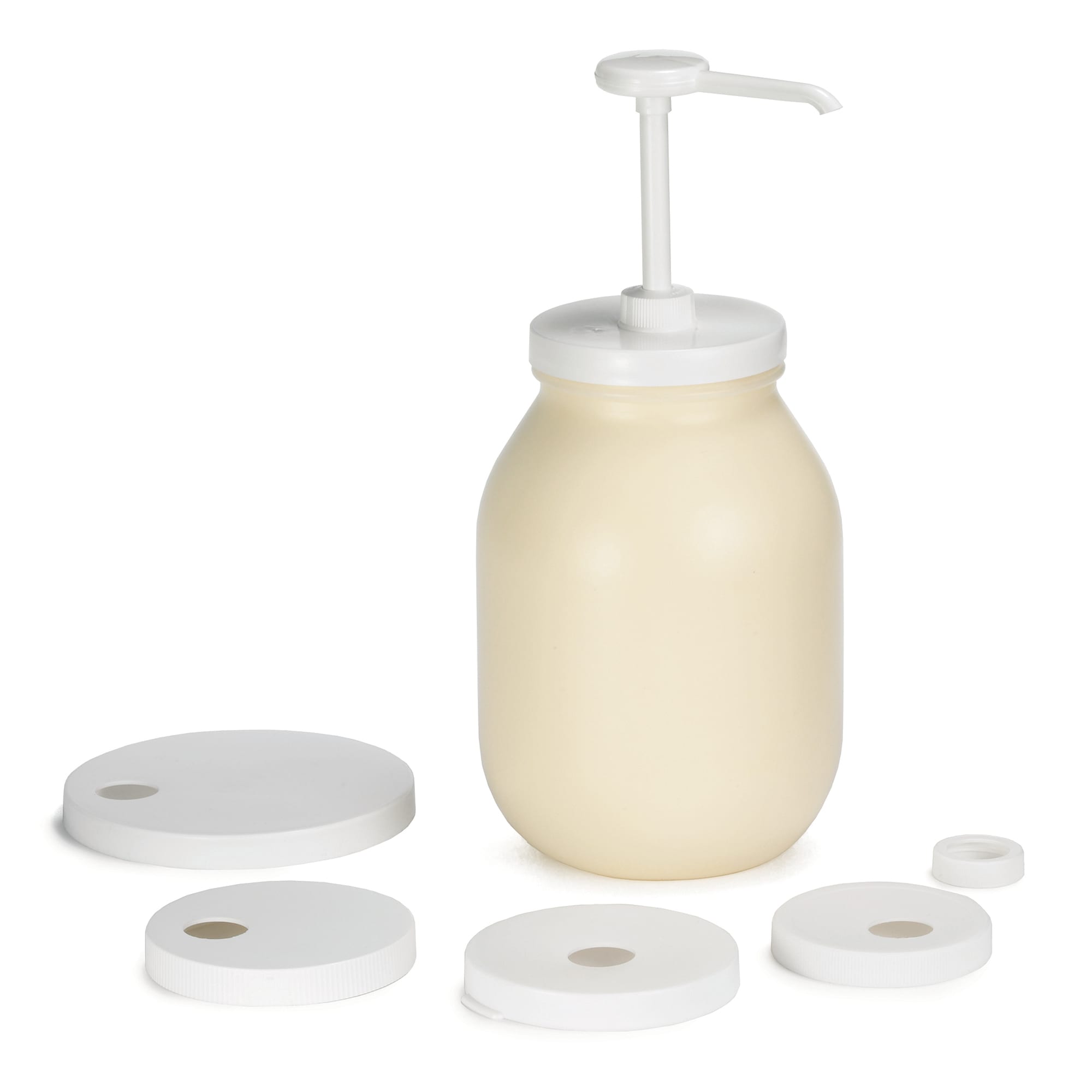 This TableCraft 1 ounce top set plastic pump kit is perfect for dispensing viscous condiments, sauces, light syrups, etc. Speeds prep and eliminates messy clean‐ups. This set includes a 662 pump plus 110mm, 38mm, 89mm, NT110mm,and 160mm tops.