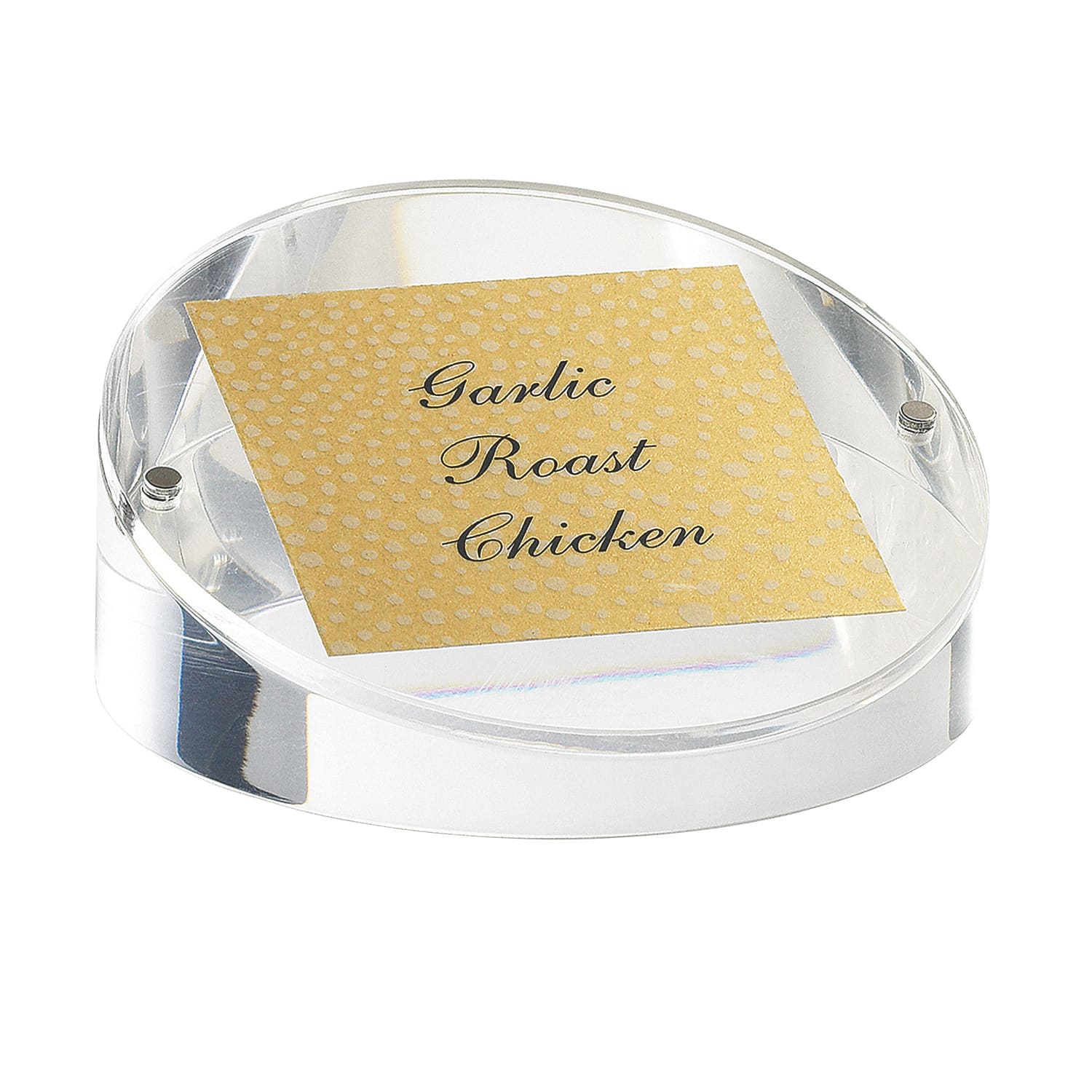 This TableCraft A360 acrylic angled card holder features magnetic clips to hold display cards securely in place. Perfect for use with Chafers!