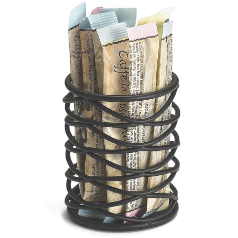 This TableCraft BK155 sleek black powder coated finish sugar caddy perfectly complements any tabletop display. The round metal sugar caddy is perfect for service sugar packets, portion packets, or sugar sticks.