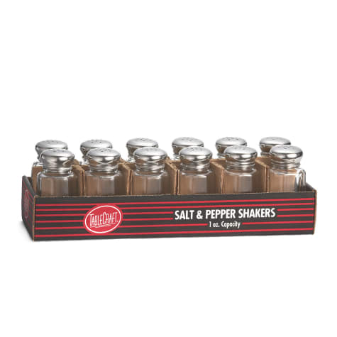 These TableCraft salt & pepper shakers feature a paneled glass body with 18/8 stainless steel mushroom shape tops. They are durable and attractive.