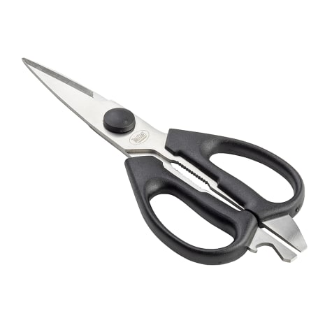 TableCraft 10995 multi‐purpose kitchen shears feature a serrated cutting edge with a bone cutting notch. Built‐in gripping tool, prying tool and cap lifter. Large comfortable poly handle. Stainless steel blades. Comes apart for easy cleaning.