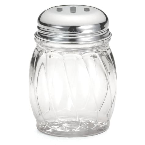 This TableCraft plastic shaker has a swirled plastic body with chrome plated slotted lid. The slotted tops are ideal for dispensing cheese or crushed pepper flakes.