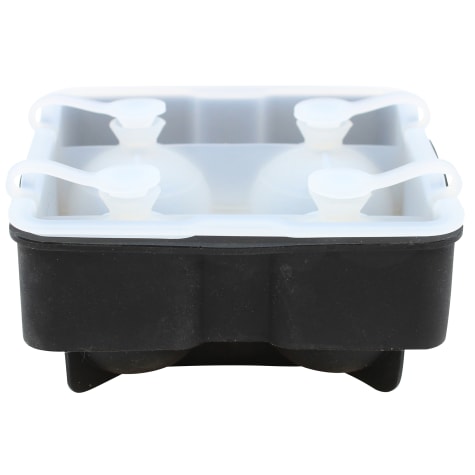 This black silicone ice sphere tray from TableCraft features four sections, with each section making a 1‐3/4" sphere.